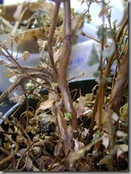 Hence my new expression: “it’s not dead until it’s WET and dead.” And since I cut back a lot of truly dead stuff and started watering this plant regularly, a couple of weeks ago, it has indeed begun bouncing back. It is not sitting up and speaking yet, but as you can see in this picture, it is valiantly producing a few new leaf buds on the central stems.