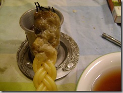 (The answer is no, which I know because I’ve tried this before. The wick eventually runs out, as Elisheva keeps reminding me, but long before that, the candle gets lumpy and generally unsightly and non-functional. It feels weird and freaky and fun to save the wax, all at the same time.)