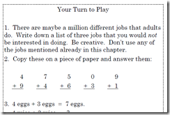 The Elementary books ALSO contain a “Your Turn to Play” section, but the nice thing about reading the book to the littles is that I can stop and MAKE them answer before going on. The instructions usually say to write down the answers (on a separate page!), but we have been doing them out loud so far. Here’s one from later on in the book that needs writing down.
